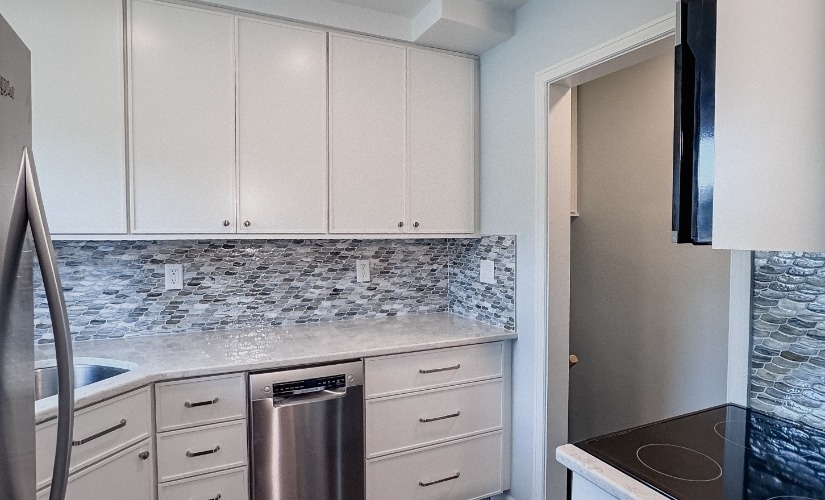 In Ann Arbor’s historic Pittsfield Village neighborhood, Marsha transformed our client’s small, outdated 8' x 7'6" kitchen into a highly functional and personalized space—all without altering the original footprint. By relocating the sink to the corner, we created enough room for an apartment-sized dishwasher and added much-needed drawer storage. We upgraded the gas range to a sleek induction range and gave it a more built-in appearance with a custom panel and extended countertop—improving both aesthetics and safety for little ones on the move. The new wood-look LVP flooring, fresh wall paint, and refreshed built-in pantry modernize the space while respecting its 1940s-era charm. To meet local code requirements, which call for outlets every 24 to 48 inches in updated kitchens, we installed a pop-up power outlet just below the window—an elegant solution where a traditional wall outlet wasn't possible due to the low window height. To maximize every inch of their 700 sq.ft. condo, Marsha even carved out additional storage above the stairwell, making this small kitchen feel smart, spacious, and uniquely theirs. To bring the design to life, we chose materials that were as functional as they were meaningful. Showplace’s sleek, modern Aspen door style in a warm, inviting shade of white brightens the room while offering timeless appeal. The glass tile backsplash from Lunada Bay Tile adds soft shimmer and gentle movement, thoughtfully chosen to echo the clients’ shared chapter living aboard a sailboat. For the floors, we selected a durable, low-maintenance wood-look LVP from Shaw Flooring—perfect for everyday living in a compact home. Contemporary hardware from Hardware Resources ties the whole design together with clean lines and practical elegance, making this petite kitchen feel both elevated and deeply personal.