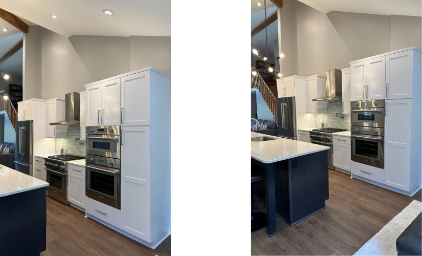 Macy moved the kitchen to a new location on the main level and removed 2 walls to open the space up. The clients now have a modern open floorplan with exposed beams and can entertain their guests while preparing a meal.