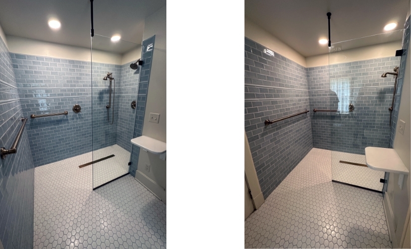 This 1920s home had an unusual master bathroom layout. Our client was interested in removing their jetted tub and fiberglass shower and upgrade to a curbless tile shower with a glass enclosure.