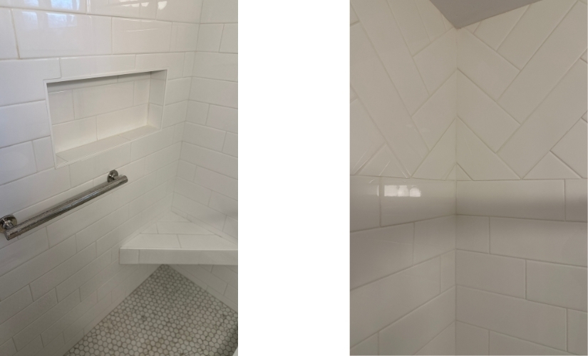 Macy created a serene sanctuary with a neutral palette and subtle tile pattern shift at the crown of the shower. The hickory harvest cabinetry is complimented with chrome fixtures and white quartz.