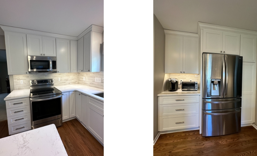 Step into this kitchen where modernity meets warmth in a harmonious blend of white and natural wood elements. The room is adorned with pristine white cabinets that line the walls, offering ample storage space and a clean, minimalist aesthetic. The cabinets are sleek, with smooth surfaces and minimalist hardware, contributing to the contemporary ambiance of the space.