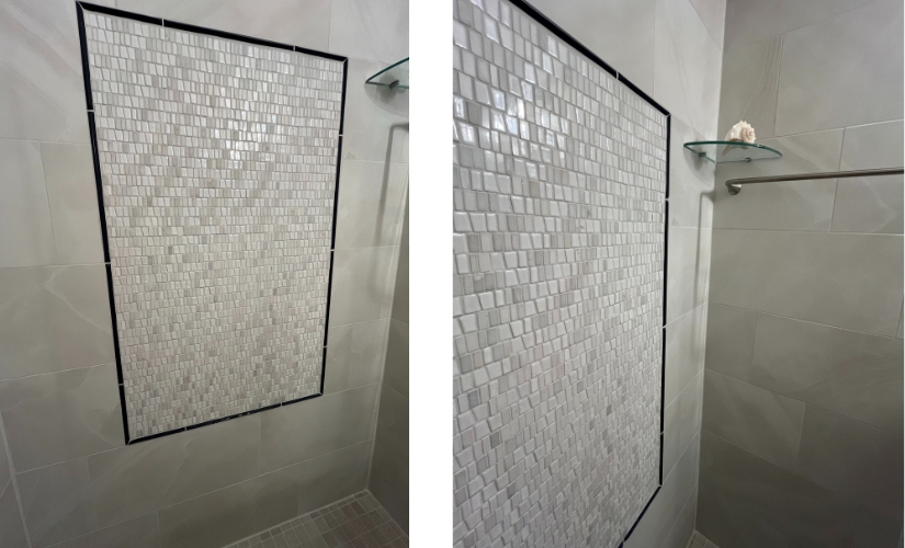 This bathroom renovation project centered around creating a luxurious and modern space, with the shower as the focal point. The homeowners wanted a design that was both functional and visually stunning, so we began by installing a large, walk-in shower with custom tile work. The shower features a beautiful framed-in tile design that adds depth and elegance to the space. The intricate tile pattern draws the eye, serving as the centerpiece of the bathroom and providing a touch of sophistication. To enhance the shower’s open and airy feel, we installed sleek glass doors that allow the tile work to be fully appreciated. The frameless glass not only adds a modern touch but also makes the bathroom feel more spacious. The glass doors seamlessly blend with the rest of the design, creating a clean and cohesive look. This combination of tile and glass creates a spa-like atmosphere, perfect for unwinding after a long day.